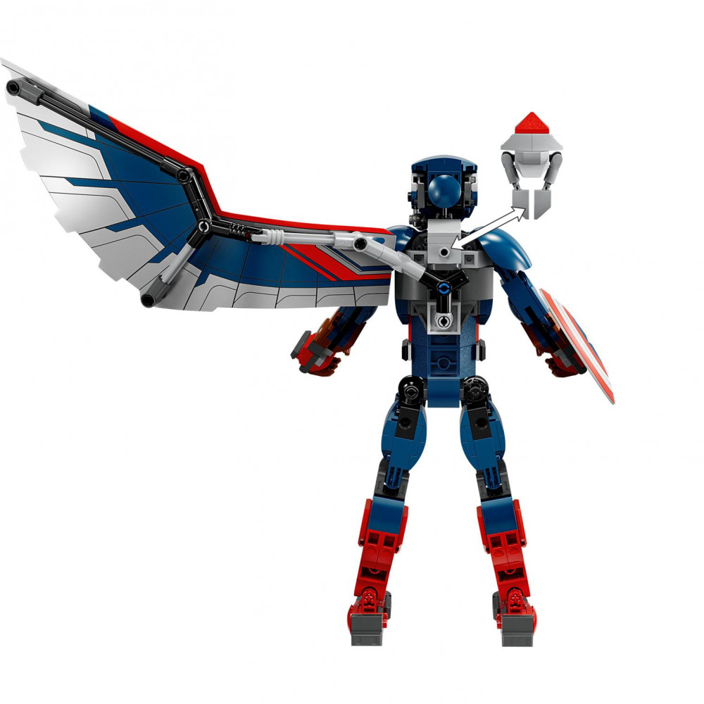 Zostaviteľný hračkársky superhrdina meria vyše 28 cm na výšku a má pohyblivé kĺby v ramenách, rukách, bedrách a nohách, takže ho deti môžu nastaviť do realistických akčných póz a následne sa ponoriť do tvorivej hry na postavy. Na chrbte figúrky sú pripevnené veľké fóliové krídla a možno ich ohýbať, takže to vyzerá, že mávajú, a takisto ich môžete ľahko odpojiť, až sa figúrka vráti na zem. Figúrka Kapitána Ameriky nesie svoj kultový štít a na chrbte má pripevneného zostaviteľného hračkárskeho drona Redwinga, ktoréh môžu deti ľahko odpojiť a hrať sa s ním osamote. Pre väčšiu digitálnu zábavu si stavitelia môžu približovať a otáčať stavebnice v 3D rozhraní a sledovať svoj pokrok pomocou zábavnej a intuitívnej aplikácie LEGO Builder.