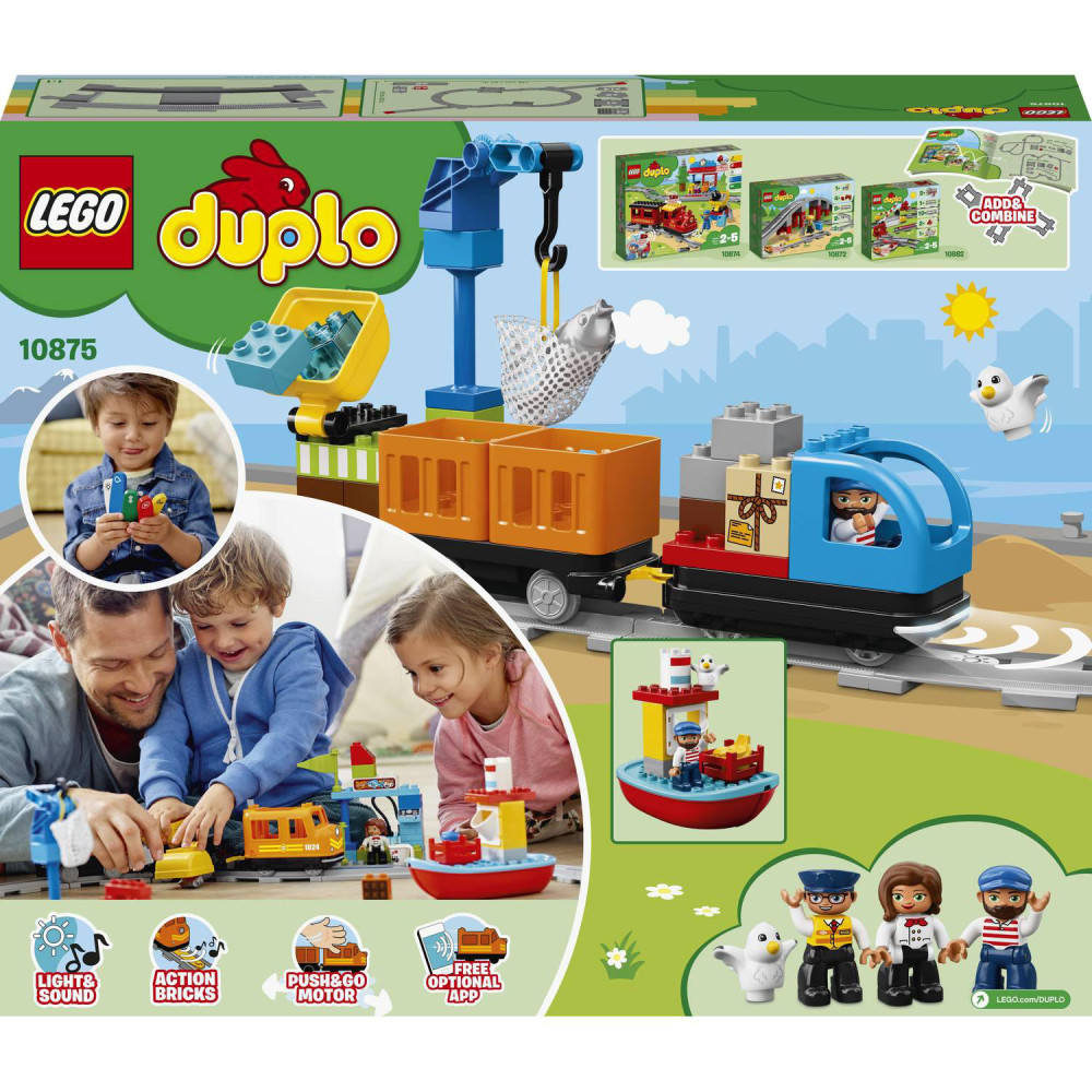 LEGO® DUPLO® 10875 Nákladný vlak je vďaka jednoduchému ovládaniu a množstvu interaktívnych prvkov vhodný aj pre tých najmenších. Deti sa môžu stať rušňovodičom vláčika s motorom s technológiou Push <(> & <)> Go - vláčik možno uviesť do chodu jemným postrčením dopredu alebo dozadu a zastaviť pridržaním alebo zdvihnutím z koľají. Pomôžte im umiestniť na koľaje 5 farebných akčných kociek, vďaka ktorým vláčik húka, rozsvecuje a zhasína svetlá, zastavuje pre doplnenie paliva, mení smer jazdy a zastavuje, kdekoľvek je libo. Sada Nákladný vlak od LEGO® DUPLO® obsahuje prístav, loďku, kaviareň, stanicu určenú na nakladanie nákladov, 2 žeriavy, 3 DUPLO figúrky, figúrku zvieratká a veľa suprových koľají, vďaka ktorým ponúka veľa klasickej zábavy na koľajniciach. Stiahnite si doplnkovú aplikáciu a získajte tak množstvo ďalších herných možností, vrátane diaľkového ovládania a spústy zábavných aktivít pre najmenších!