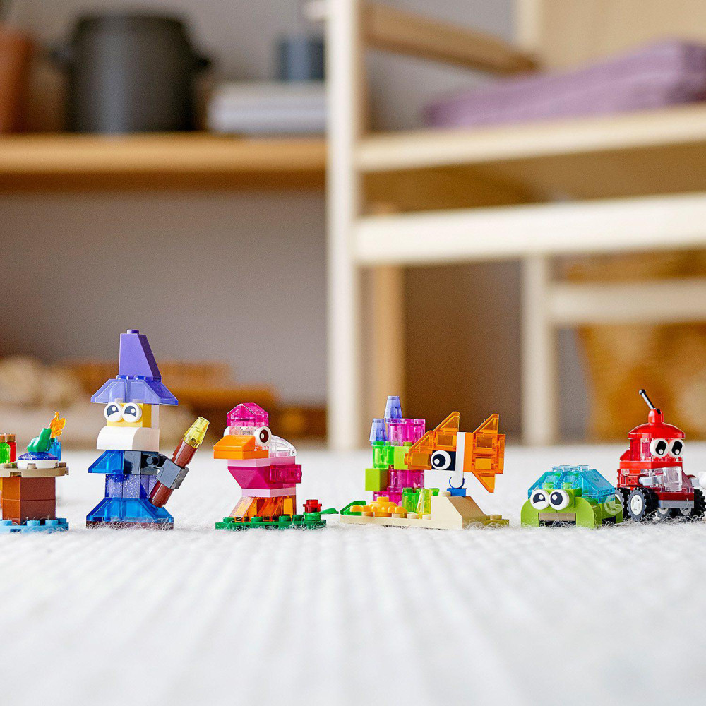Sada priesvitných kreatívnych kociek (11013) zo série LEGO® Classic obsahuje ohromnú škálu priesvitných LEGO kociek rôznych tvarov, farieb a veľkostí, ako aj vzrušujúci výber klasických LEGO kociek, dielikov, očí a koliesok. Skrátka všetko, čo deti potrebujú na hodiny tvorivých hier.