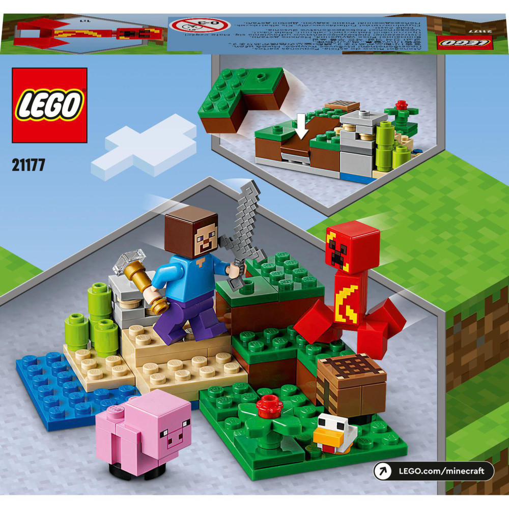 Kopa zábavy v neveľkom balení pre hráčov Minecraftu V tomto neveľkom, klasickom dobrodružstve zo sveta Minecraft sa deti budú zabávať celé hodiny. K Steveovi, ktorý patrí medzi hlavné postavy hry, sa pridá prasiatko, kuriatko a výbušný Creeper. Najprv môžu deti otestovať svoje zručnosti pri výrobnom stole. Keď je práca hotová, postarajú sa o zvieratká a o svoju úrodu cukrovej trstiny, prípadne môžu scénku vyzdobiť divým makom. Potom sa s mečom v ruke pustia do boja proti výbušnému Creeperovi. Bojová scéna vrcholí, keď deti stlačia špeciálny výbušný blok, ktorý vybuchujúceho Creepera odpáli do vzduchu. Keď je akcii koniec, tento zábavný svet skvele vynikne vystavený v detskej izbičke.