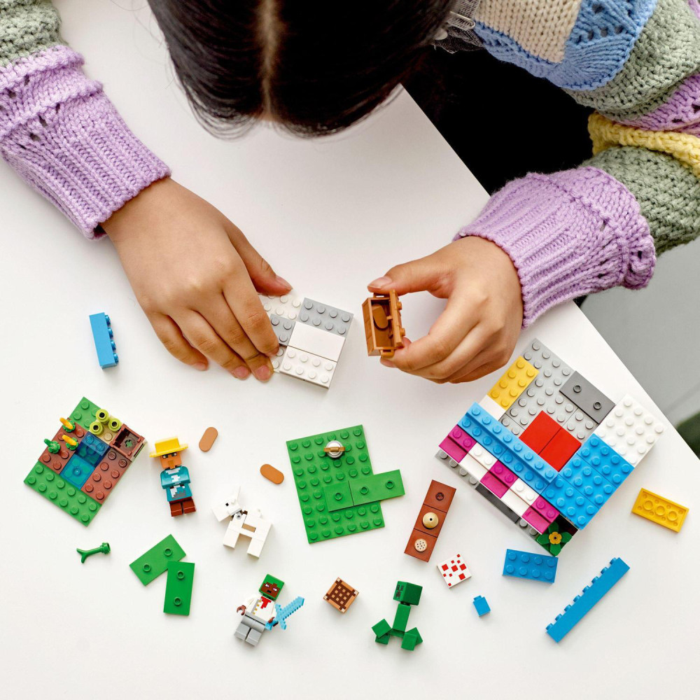 Zábavné prestavovanie pre tvorivé deti V tejto akčnej stavebnici Minecraft sa to len hemží hernými možnosťami. V zostave postavičiek z Minecraftu nájdete pekára, snežného dedinčana, kozu a Creepera. Rušnú pekáreň tvorí zariadená miestnosť, v ktorej sa deti môžu zahrať na príbehy vystrihnuté z bežného života. Skôr než sa však pustia do pečenia chlebíka a sušienok, musia si prichystať všetky prísady. Farmárovi pomôžu vypestovať pšenicu a potom podoja kozu. So všetkými prísadami sa potom vrátia k pekárovi a predvedú svoj pekársky talent. Napínavú atmosféru dotvára obávaný Creeper, ktorý sliedi naokolo a má v pláne zničiť truhlicu s cenným vajíčkom. Deti majú za úlohu pekáreň ochrániť pomocou klasickej zbrane z hry – diamantového meča. Keď je súbojom koniec, modulárny set možno jednoducho prestavať a užívať si nové dobrodružstvá.