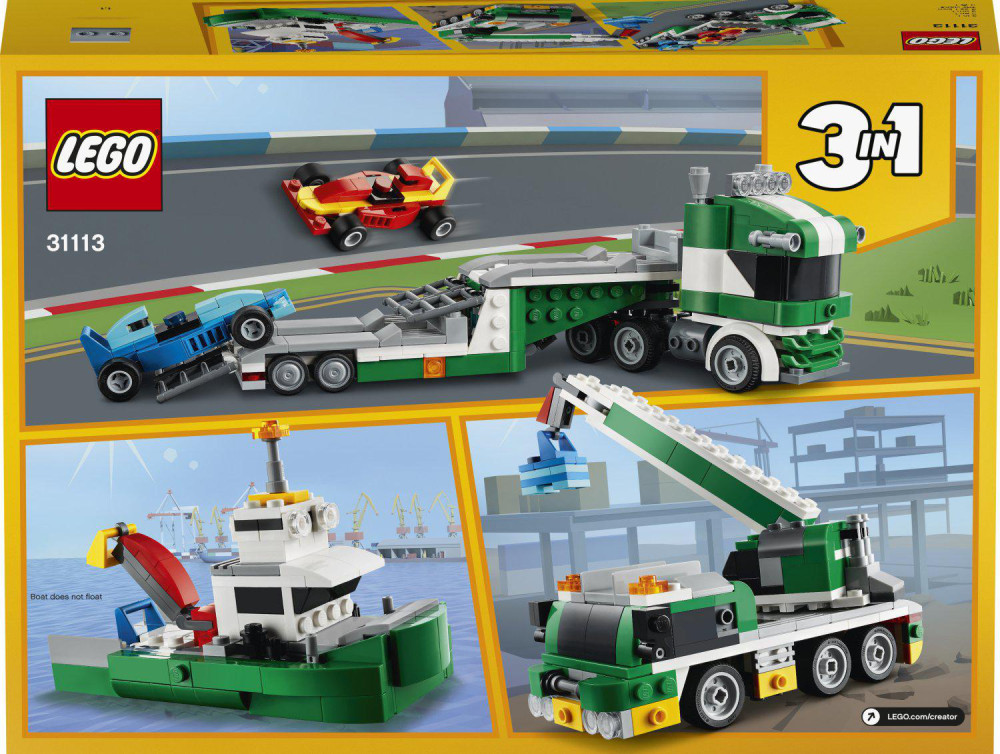 S kamiónom na prepravu pretekárskych áut 3 v 1 (31113) zo série LEGO® Creator čakajú na malých staviteľov vzrušujúce pretekárske dobrodružstvá. Dodávka s odnímateľným prívesom na prepravu 2 rýchlych áut, ktoré možno vyložiť z rampy, umožní deťom vychutnať si pretekársku akciu.