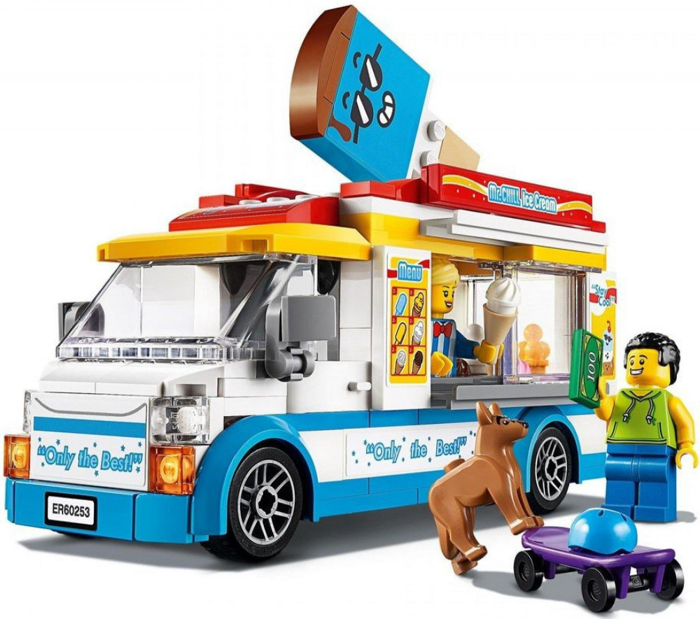 Deti sa môžu stať hrdinami každodenného života s touto zábavnou stavebnicou LEGO® City Zmrzlinárske auto (60253). Keď deti začnú podávať zmrzlinu a nanuky rozhorúčeným obyvateľom mesta LEGO City, stanú sa ihneď hrdinami dňa! A s priestorom vnútri auta pre pani zmrzlinárku, v ktorom môže pracovať a šoférovať, a zákazníkom na skejtborde s roztomilým psíkom táto stavebnica ponúka kopec zábavy pri samostatnej hre na postavy.