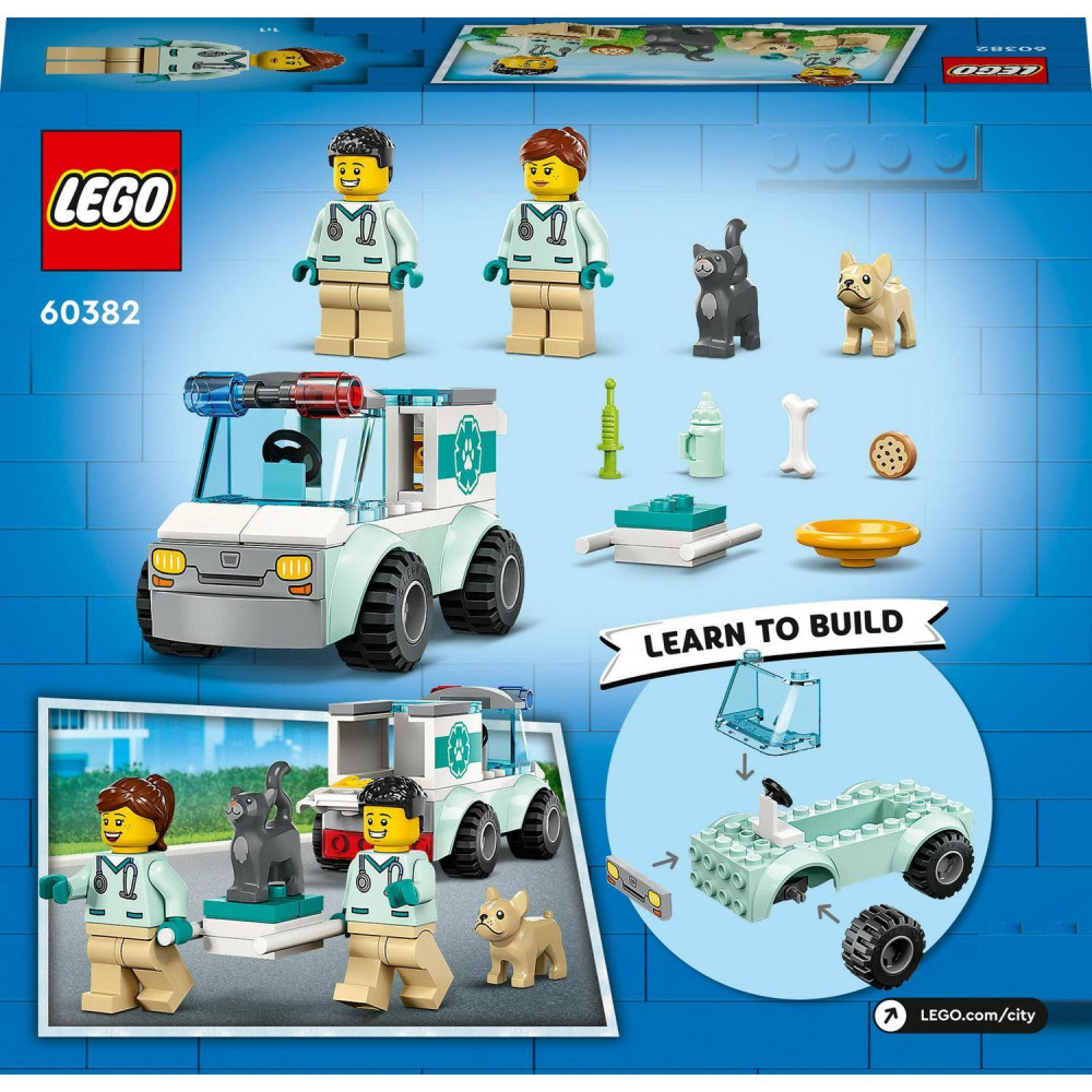 Nádejní veterinári a milovníci zvierat od 4 rokov si zamilujú túto stavebnicu veterinárnej záchranky zo série LEGO® City (60382), ktorá obsahuje záchranku s odnímateľným nosidlom, 2 minifigúrky veterinárov, figúrky psa a mačky a zábavné doplnky na celé hodiny ošetrovania zvierat