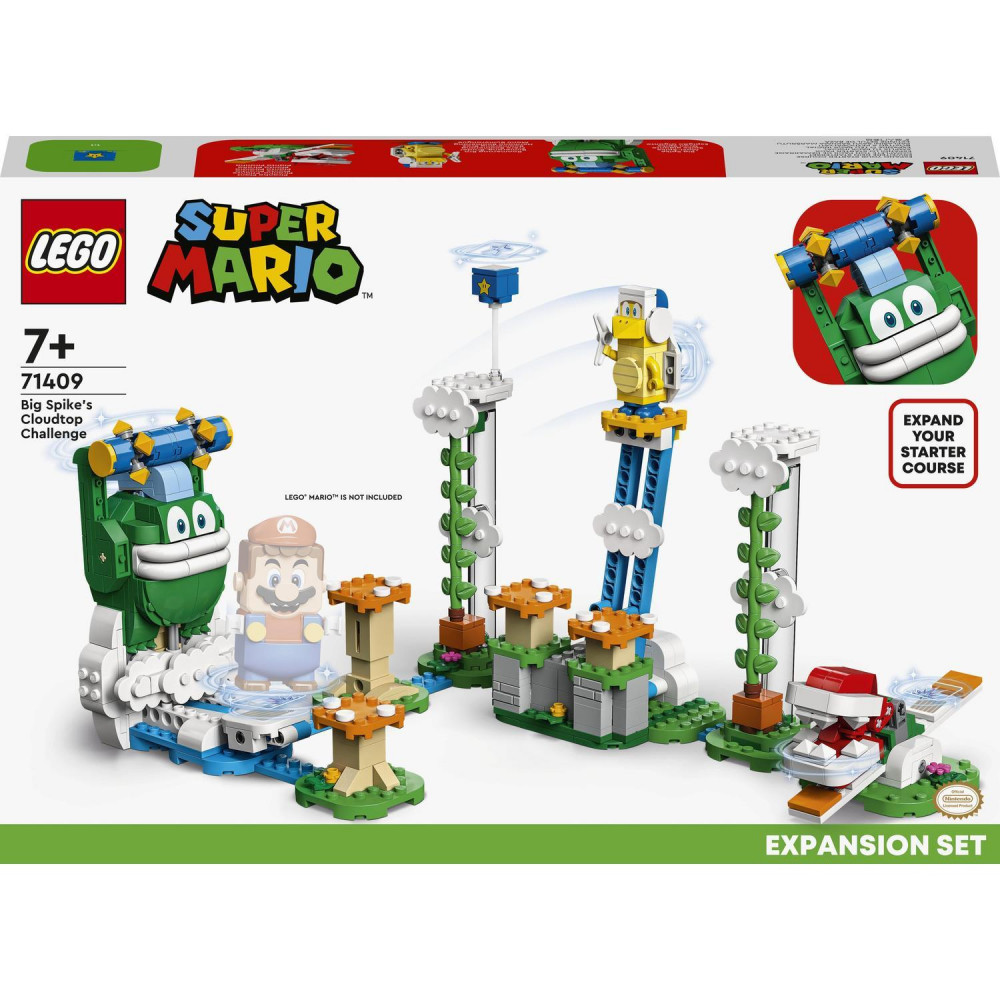 S rozširujúcim setom LEGO® Super Mario™ Oblačná výzva s Veľkým Spikeom (71409) si deti môžu psotaviť vlastný herný level v oblakoch. Set obsahuje typické prekážky z videohier Super Mario™ a 3 figúrky LEGO známych protivníkov –Veľkého Spikea, Boomerang Broa a piraňovú rastlinku. Hráči majú za úlohy pomôcť LEGO® Mariovi, LEGO® Luigimu alebo LEGO® Peach (nie sú súčasťou setu) poraziť Veľkého Spikea, dostať sa k Boomerang Broovi skokom z oranžových trampolín v tvare huby, získať akčnú kocku Super Star a mnoho ďalšieho. Ich snaha bude odmenená bohatým množstvom digitálnych mincí. (Poznámka: Pre plnohodnotný herný zážitok sa vyžaduje štartovací set 71360, 71387 alebo 71403.)