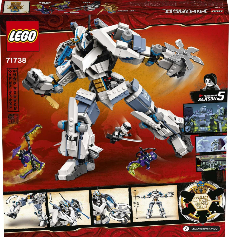 Nechajte svojich malých fanúšikov nindžov zažívať napínavé scény z piatej série televízneho seriálu LEGO® NINJAGO® s touto vynovenou stavebnicou Zaneova bitka s titanskými robotmi (71738). Robot má polohovateľné nohy a ruky, v ktorých drží meč a rotujúcu reťazovú pílu. Okrem toho na ňom nájdete dva pružinové vystreľovače a kokpit pre minifigúrky nindžov. Deti si túto vylepšenú modernú verziu pôvodného robota zamilujú.