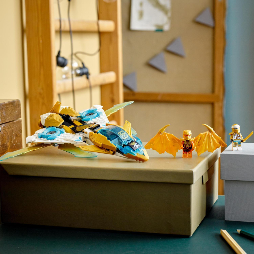 Táto stavebnica LEGO® NINJAGO® Zaneova zlatá dračia stíhačka (71770) deťom poslúži pri hrách na akčné scény zo seriálu NINJAGO: Crystallized. Táto pôsobivá stíhačka NINJAGO je vybavená kabínou, do ktorej možno posadiť minifigúrky nindžov, ako aj vysúvateľnými zlatými krídlami, vďaka ktorým pripomína lietajúcu nindža hviezdu.