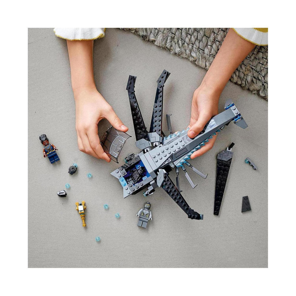 Špičkový superhrdinský bojový letún Táto autentická replika legendárneho lietajúceho stroja Black Panthera je naozaj výnimočný kúsok, ktorý deťom prinesie ten najlepší zážitok pri stavaní aj po vystavení. Tento futuristický letún z Wakandy obsahuje 4 nastaviteľné krídla – ktoré sa pohybujú dopredu, dozadu, nahor a nadol –, 2 projektilové vystreľovače a otváraciu kabínu, do ktorej možno k riadiacemu panelu posadiť minifigúrku. Stavebnica obsahuje 3 minifigúrky, ktoré inšpirujú k nápaditým hrám: Black Panther, jeho sestra Shuri a bojovník zo zlej rasy Chitauri vyzbrojený energetickým blasterom.