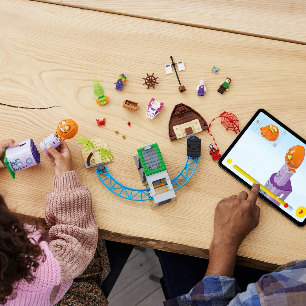 Superhrdinské bitky, poklady a pasce Stavebnica obsahuje 4 minifigúrky – Milesa Moralesa, Ghostyho, Sandmana a Zeleného goblina, a takisto aj zostaviteľný vrak pirátskej lode, koľajnice na prepravu ukradnutého pokladu, jaskyňu slúžiacu ako väzenie, maják so sídlom Zeleného goblina a množstvo ďalších doplnkov. Štartovacia kocka steny dodá malým deťom pri stavaní a prestavovaní stavebnice istotu. Jednoduché pokyny nájdete v podobe farebného návodu na stavanie plného obrázkov alebo zažite ešte viac digitálnej zábavy a použite aplikáciu LEGO Builder. Jej intuitívne nástroje na zväčšovanie a otáčanie zobrazenia pomáhajú deťom, aby si dokázali svoj model počas stavania lepšie predstaviť.
