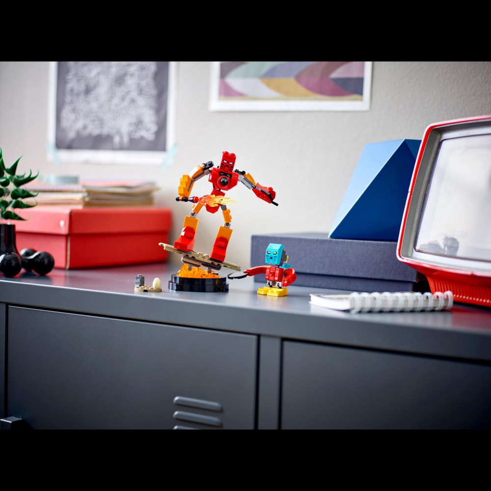 V roku 2001 predstavila skupina LEGO Group nový rad, ktorý sa stal svetovou senzáciou: BIONICLE®. Príbeh mocných hrdinov so živelnými schopnosťami uchvátil celý svet a stal sa inšpiráciou pre mnohé komiksy, filmy a knihy. Teraz sa k vám vracajú dve najobľúbenejšie postavy tohto radu v stavebnici LEGO® Icons BIONICLE Tahu a Takua (40581). Kĺbové akčné figúrky sú vyzbrojené ohnivým mečom a vrhačom diskov. V sete nechýba ani lávový výstavný podstavec, aby ste mohli sérii BIONICLE vzdať hold doma alebo v práci.